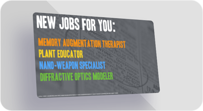 New Jobs for you: memory augmentation therapist plant educator nano-weapon specialist diffractive optics modeler https://static1.squarespace.com/static/546d61b5e4b049f0b10b95c5/t/54ac33c8e4b00d49fabfccf7/1420571594648/ClassifiedListing.png?format=1500w