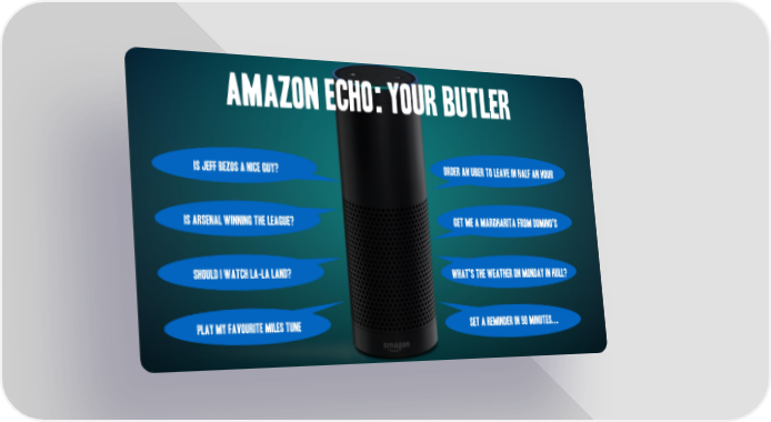 Amazon Echo: your butler Is Jeff bezos a nice guy? order an uber to leave in half an hour Is arsenal winning the league? get me a Margharita from domino’s should i watch La-La Land? what’s the weather on monday in hull? play my favourite miles tune Set a reminder in 90 minutes...